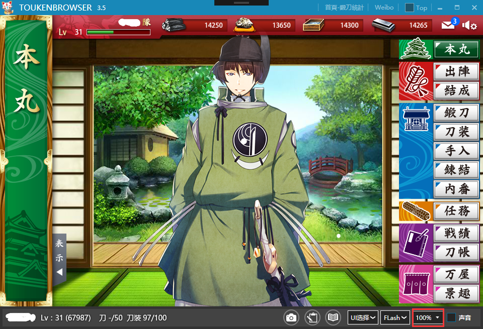 用浏览器进入游戏,确认游戏界面是正常提取的(没有滚动条,没有多余的白边),并且游戏缩放比例是100%。