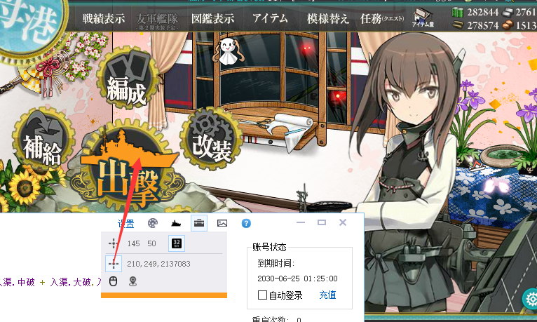 将刚才取到的坐标和数据取出来,使用Base.IsColor()来判断这个坐标是否符合这个颜色。 下面这个脚本在母港运行脚本,就会输出”在母港“,在其他界面就会输出”不在母港“,运行试一下吧