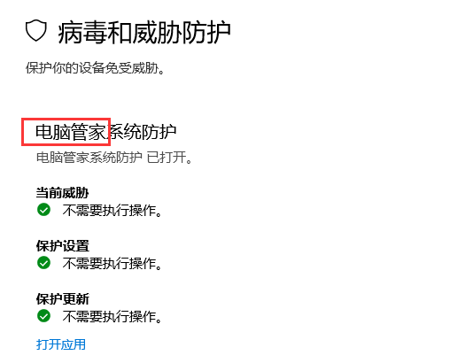 win10自带的杀软已经将杀毒的功能转交给了他,点下面的打开应用可以打开对应的杀软。